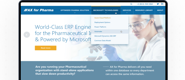 Создание сайта для разработчика официального расширения для Microsoft Dynamics 365, позволяющего фармацевтическим и биотехнологическим компаниям и производителям медицинского оборудования автоматизировать процессы производства и управлять нормативными рисками.